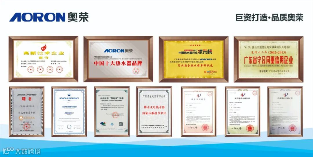 奥荣曾荣获“2019年度厨电影响力品牌”、中国家电协会“副主任委员单位””、“高新技术企业”、“2017热水器行业状元榜”、广东省守合同重信用企业(2002-2013)、获得CE/CB/EK/ROSH等多项出口认证等;