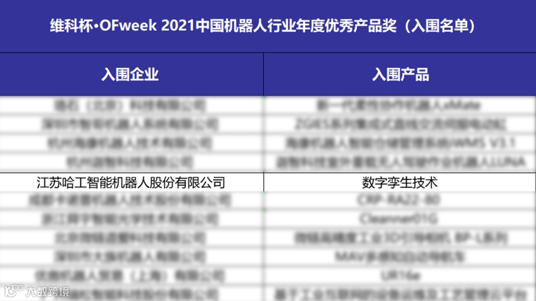 日前,知名机器人行业媒体OFweek公布了“维科杯 · OFweek2021中国机器人行业年度评选”入围名单,哈工智能旗下数字孪生技术入围“年度优秀产品”。这是旗下数字孪生技术首次进入行业评选体系,与众多优秀创新产品同台竞技,入围意味着市场对哈工智能数字化服务能力的认可。
