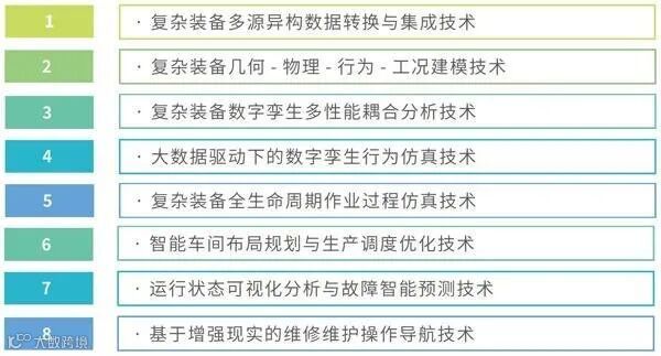 数字孪生最早由美国的一位教授提出的,其主要实现实体模型跟虚拟模型之间的连接。具体而言,以数字孪生八项关键技术的第二项,复杂装备几何-物理-行为-工况建模技术为例,运用复杂装备数字孪生多性能耦合分析,在大数据驱动下进行数字孪生行为仿真与复杂装备全生命周期作业过程仿真,实现了智能车间布局规划与生产调度优化技术、运行状态可视分析与故障智能预测技术、基于增强现实的维修维护操作等技术。