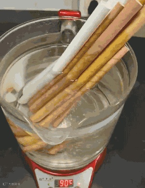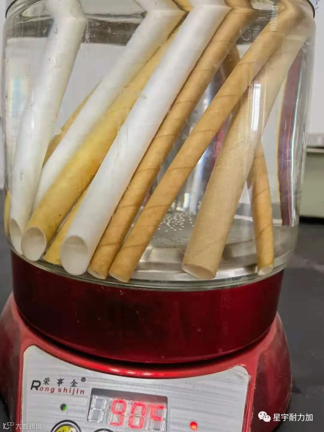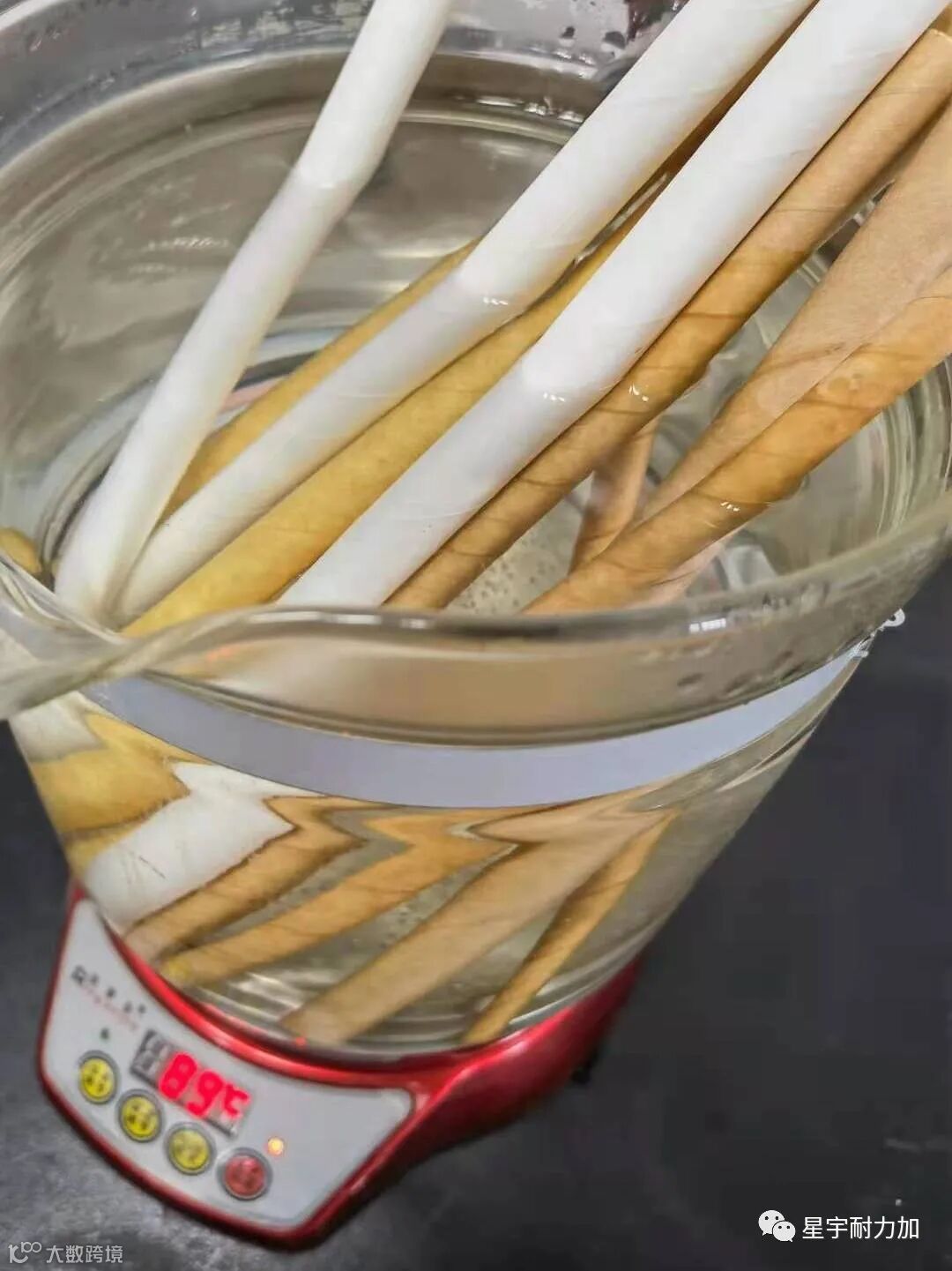 为了检测星宇耐力纸吸管的坚固程度,我们将纸吸管样本放到热水中浸泡一个小时,随着时间的流逝,让我们一起观察纸吸管的软化程度。