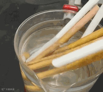 (▲1小时之后,将样本取出,搅拌敲打,纸吸管没有松散开裂,仍然保持管状并有一定硬度)