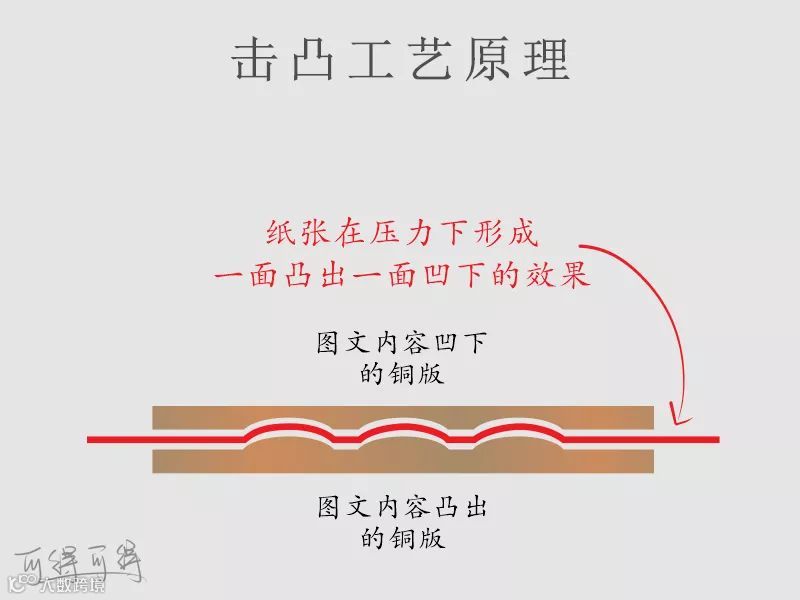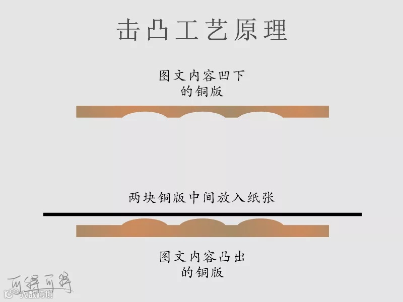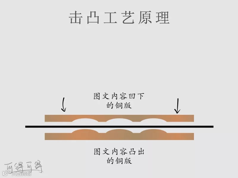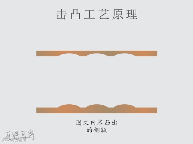 1.击凸版:将设计稿的图文雕刻加工至金属板上,一块阳版图文内容凸出,一块阴版图文内容凹下(凸版一般为金属铜、锌版,凹版一般为金属版或者树脂版)。