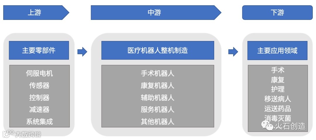 医疗机器人产业链的上游为机器人零部件,主要由伺服电机、传感器、控制器、减速器、系统集成构成;中游为医疗机器人整机的生产制造;下游供给于智慧医疗市场的需求端,主要应用于医疗的手术、康复、护理、移送病人、运输药品等领域。