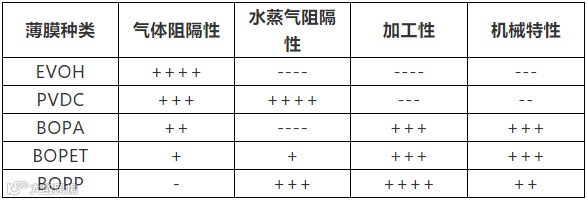 外层及功能层常用薄膜特性对比