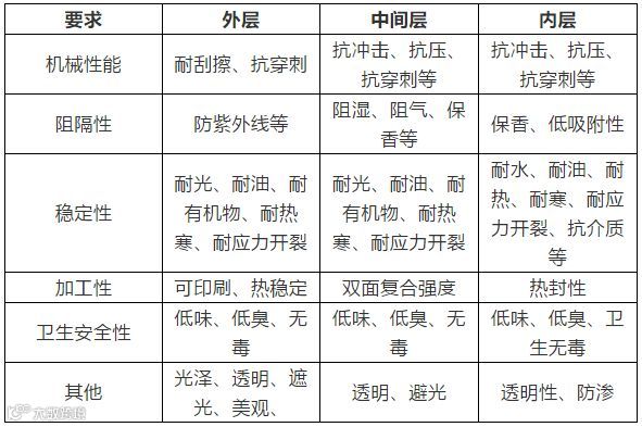 常用食品软包装薄膜各层性能要求