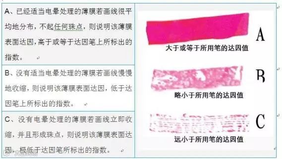 此外材料表面的清洁度,如指纹及油脂等亦会降低其达因值。因此测试膜的达因值是生产中不能缺少的步骤。