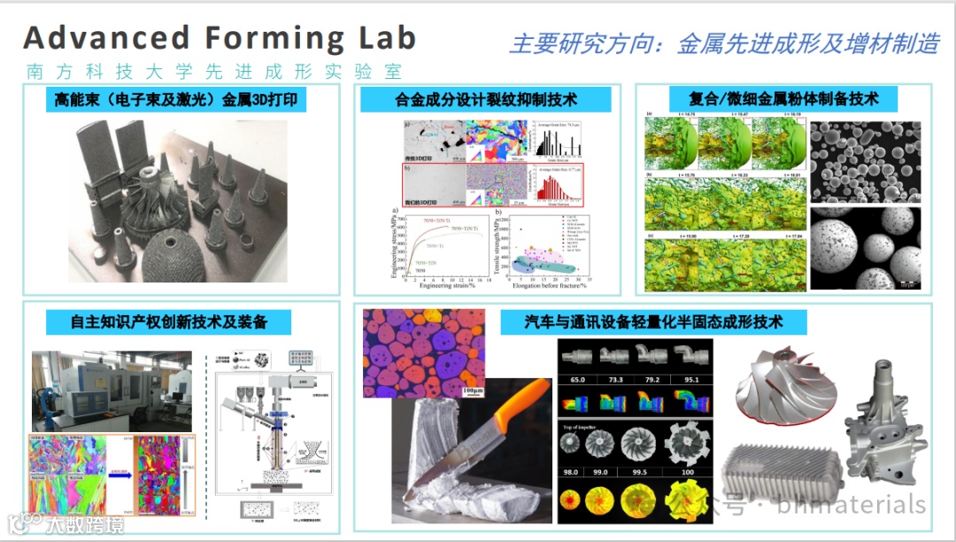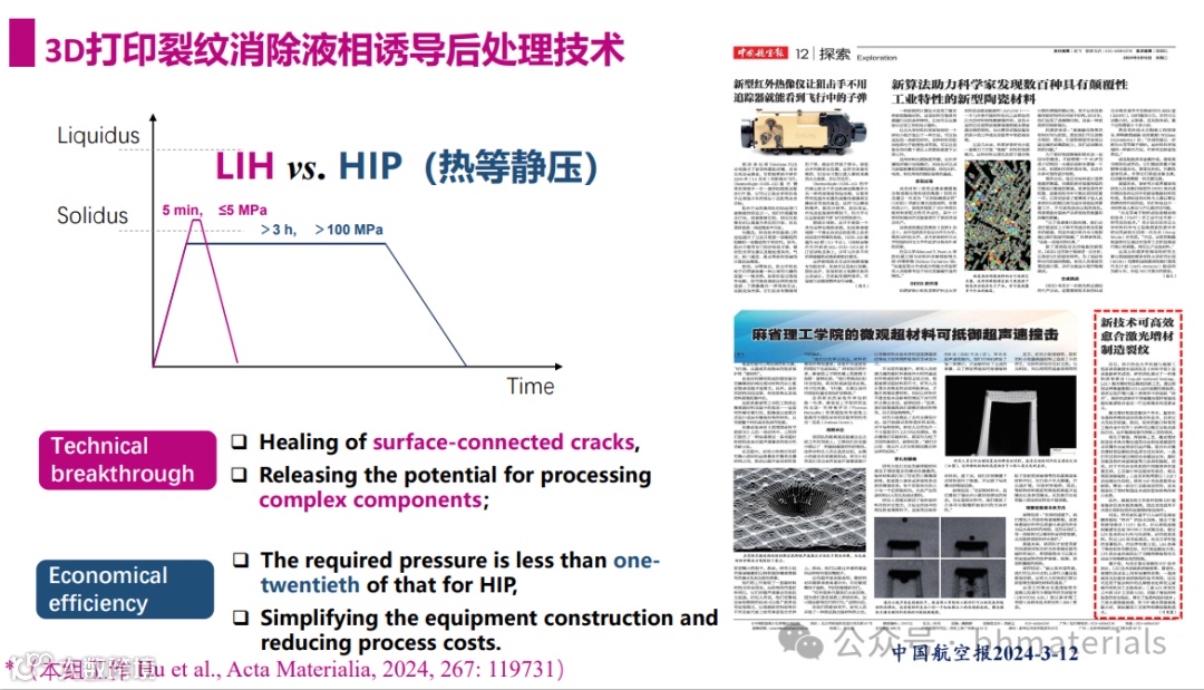解决方案实例:他详细说明了通过添加TC4、IMC(Ti2AlNb)、纳米二氧化钛(TiO2)以及双尺度晶粒细化剂等,成功实现了7075等高强度铝合金的无裂纹、高致密度增材制造。