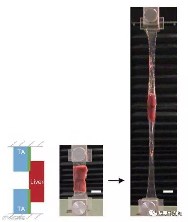 哈佛大学便以此为原型,制备了一种新型双层水凝胶TA,这种水凝胶提取模拟了鼻涕虫体内双层藻酸盐——聚丙烯酰胺基质延展结构。同时借鉴其静电作用、共价键、物理渗透作用,确保粘连的强度。