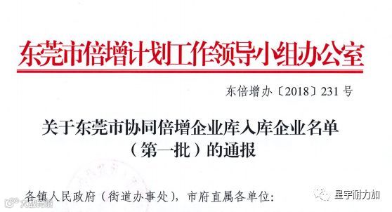 经组织申报、审核推荐、市倍增办遴选委员会讨论、二次征求部门及镇街意见、市倍增办工作会议审议和市政府审定等流程,星宇耐力确定为第一批东莞市协同倍增企业。