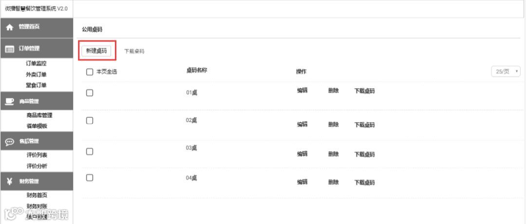 美食广场公用桌码创建在商户后台的门店管理内增加公用桌码列表入口。商户在后台可以创建桌码,创建桌码时需填写桌码名称。