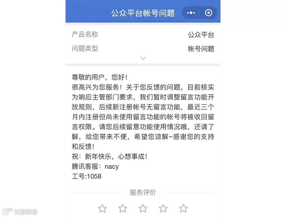 微信团队为进一步规范公众平台生态环境,后续新注册的账号将没有留言功能,最近三个月内注册,但尚未使用留言功能的账号将被收回留言权限。