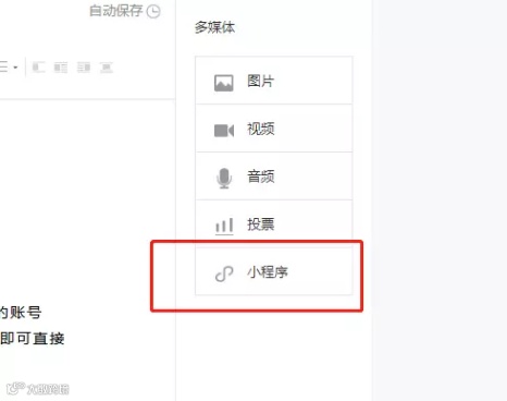 在公众号编辑文章的界面里,右边的选项里就有一个小程序的选项,点击这里就可以在文章中嵌入小程序。嵌入的方式有三种:文字、图片和小程序卡片。大家可以根据自己喜欢的方式选择。