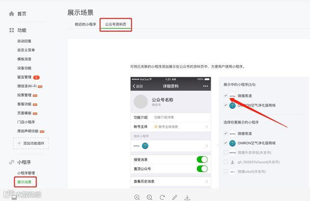 如果前期没有勾选展示在公众号资料页的选项,还在展示场景里面重新进行勾选,勾选后同样能出现在公众号的首页。
