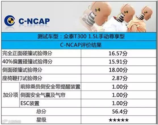 本次众泰T300C-NCAP评价测试共包括4项试验:正面100%碰撞、正面40%碰撞、侧面碰撞以及座椅鞭打,从不同角度、方向对车辆的碰撞安全性能提出更严格的要求。中国汽车技术研究中心试验数据显示,众泰T300在这四个方面分别获得16.57分、15.91分、18.00分、2.87分,且侧面碰撞获得满分的成绩。此外,值得一提的是,众泰T300对前排乘员侧安全带提醒装置、侧面安全气囊及气帘、电子稳定控制系统(ESC)3项试验还获得了3分的额外加分,最终成绩为56.4分。