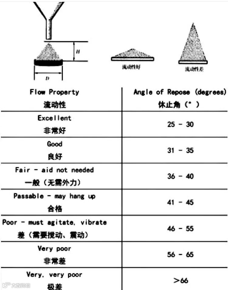 ①休止角(即安息角)在重力场中,颗粒在粉末堆积层的自由斜面上滑动时所受重力和粒子之间摩擦力达到平衡而处于静止状态下测得的最大角度,即将粉末堆积成尽可能陡的圆锥体形状的斜面,而斜边与水平线的夹角即为休止角。休止角是检验粉体流动性好坏的最简便方法。粉末流动性越好,休止角越小;粉末表面粗糙,粘着性越大,则休止角也越大。一般认为,休止角≤40 o,流动性好;休止角≥40 o,则流动性差。