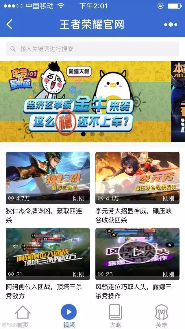 首页为王者荣耀整体功能介绍。顺着手指一直往下滑,能看见新闻公告、游戏视频、游戏攻略等,用户能够直接点击进去查看相关内容。