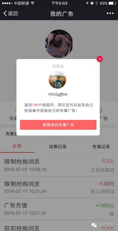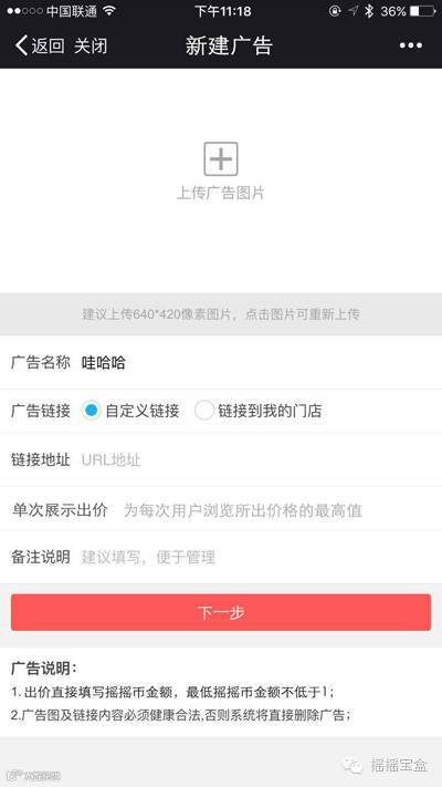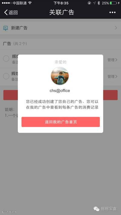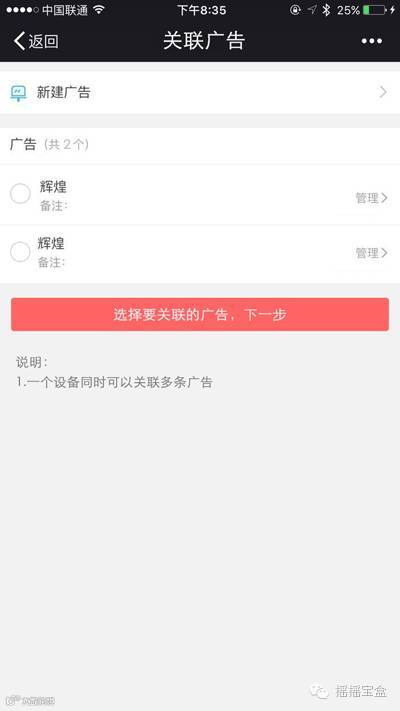 广告创建完成后进入下一步【关联广告】,选中广告后按提示操作即可;这里需要注意的是,只有关联设备后才可以展示广告,一个微信可以绑定多台设备,一个设备可以关联多条广告。若设备主创建多条广告并关联在同一台摇摇宝盒设备上时,当用户摇一摇时,会随机显示其中一条广告哦~