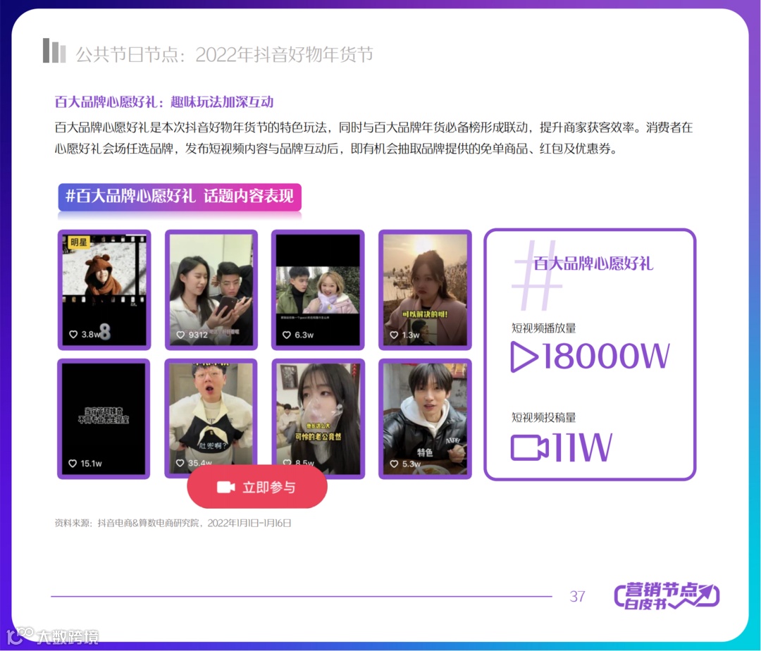 抖音在 618 落幕之际推出一份大促营销宝典,少见地呈现出了 100+ 个品牌的大促营销实践,抖音电商的想法可以说是很直白了:既是为品牌 618 复盘提供参照系,也是为品牌下一次大促备好参考书。