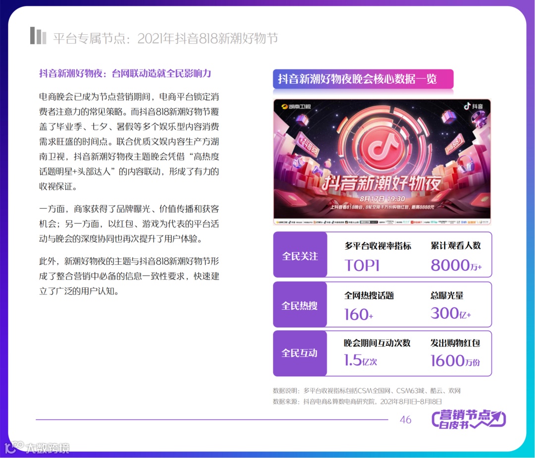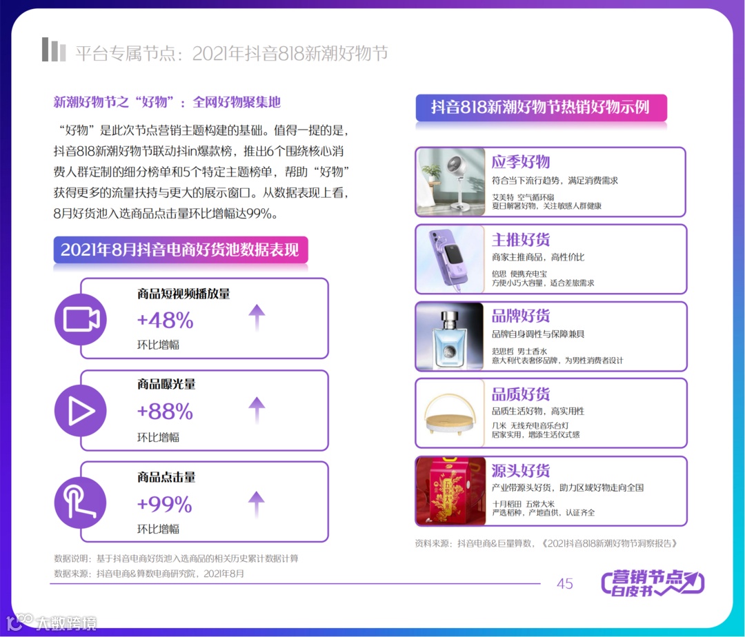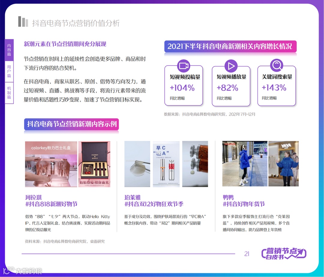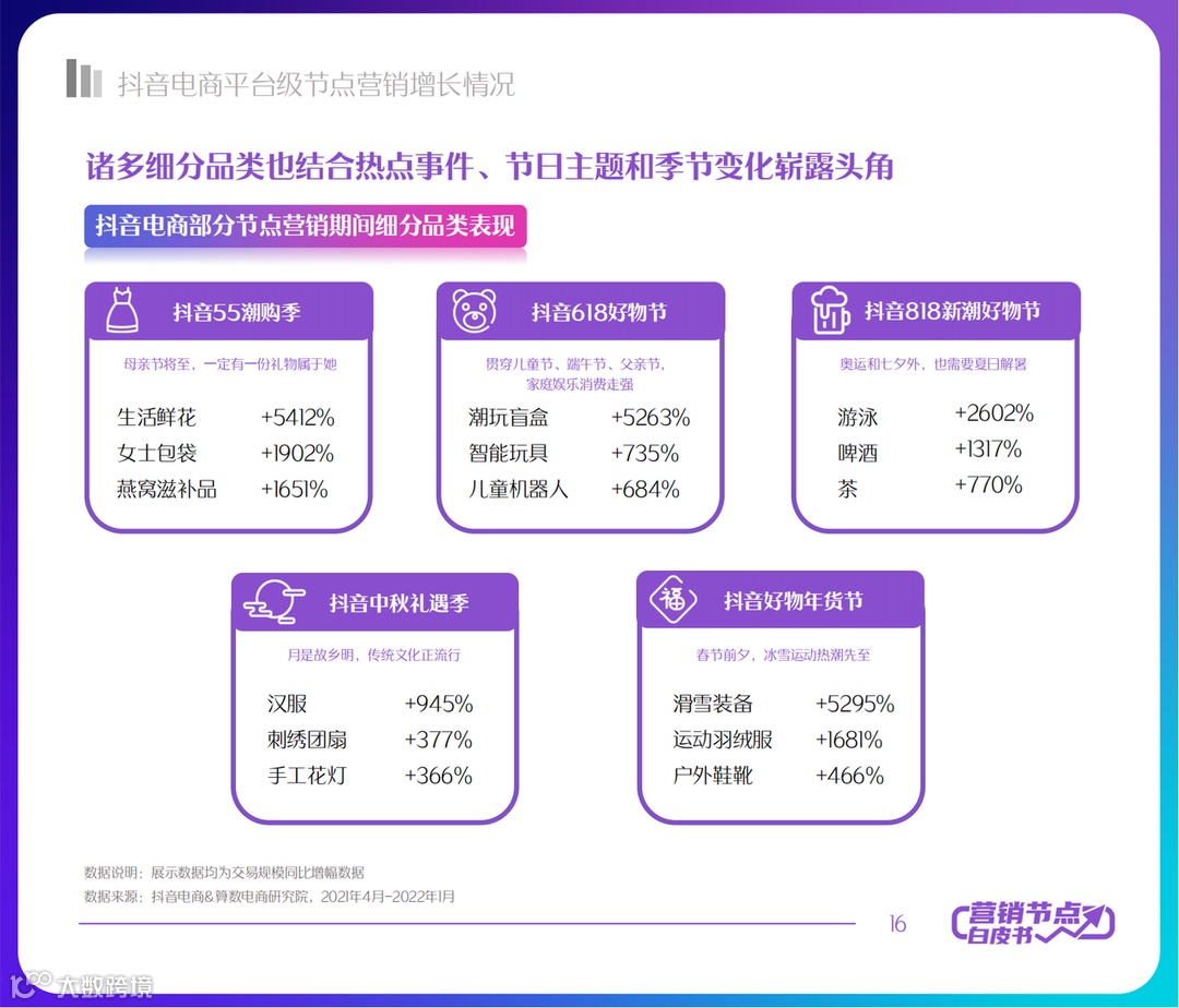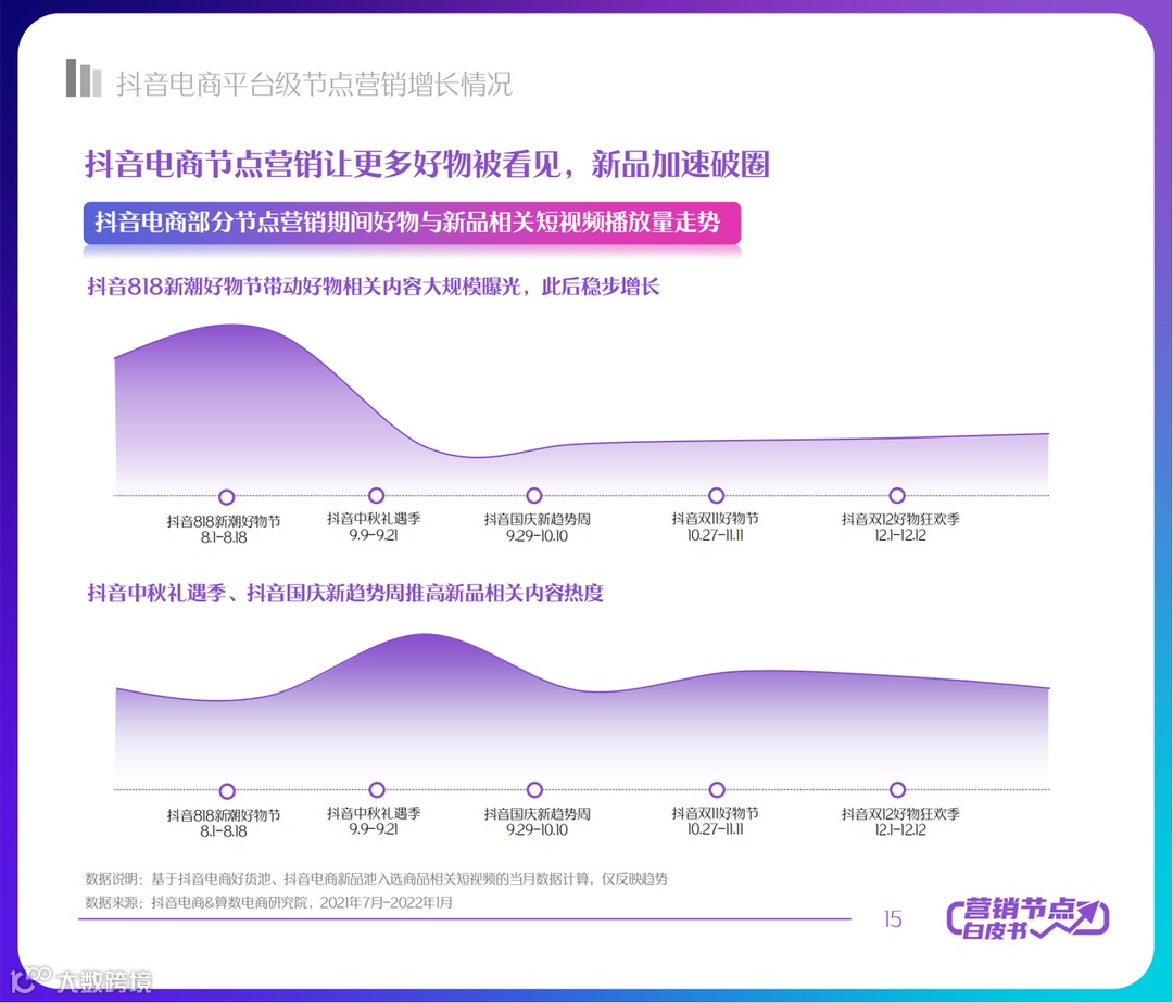 找准内容赛道、积蓄内容资源、建立全域内容阵地,这三重方法论一定程度上为品牌指明了方向。结合《2022 抖音电商节点营销白皮书》来看,如 618、双 11 这样的行业共性节点、如春节、国庆这样的公共节日节点以及如抖音 818 新潮好物节这样的平台专属节点,都将成为品牌探寻增长突破口的时机。平台专属节点面向品牌开放了更丰富的主题,较之另两个节点更能发挥品牌的能动性。