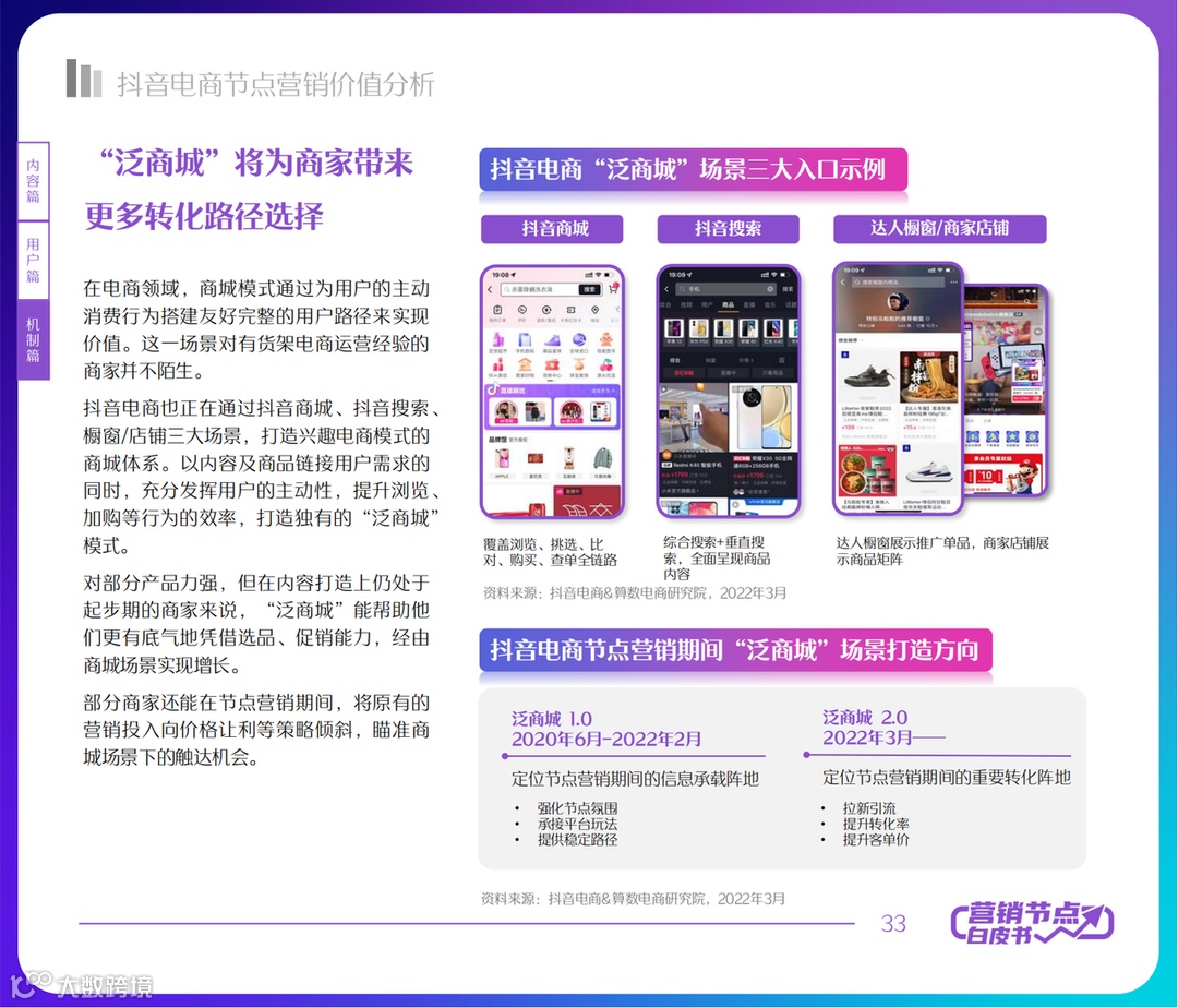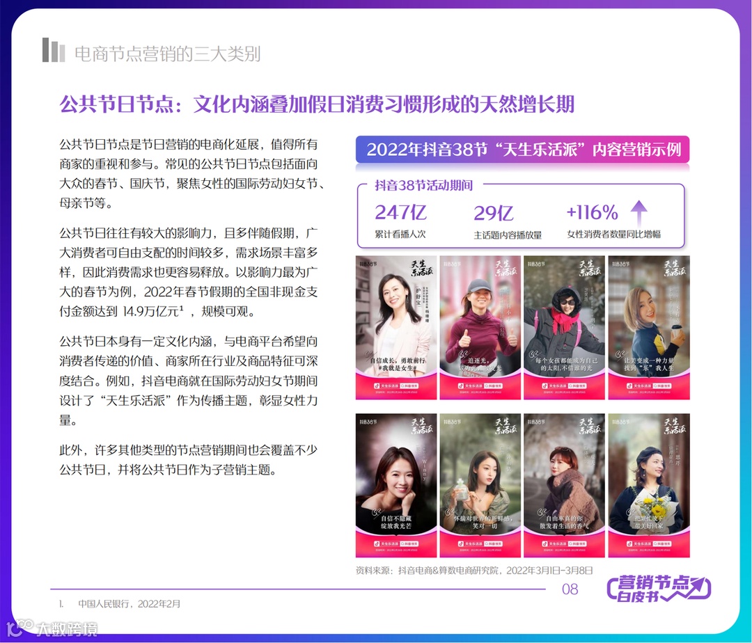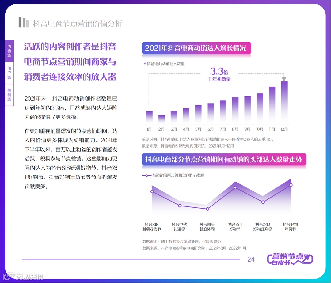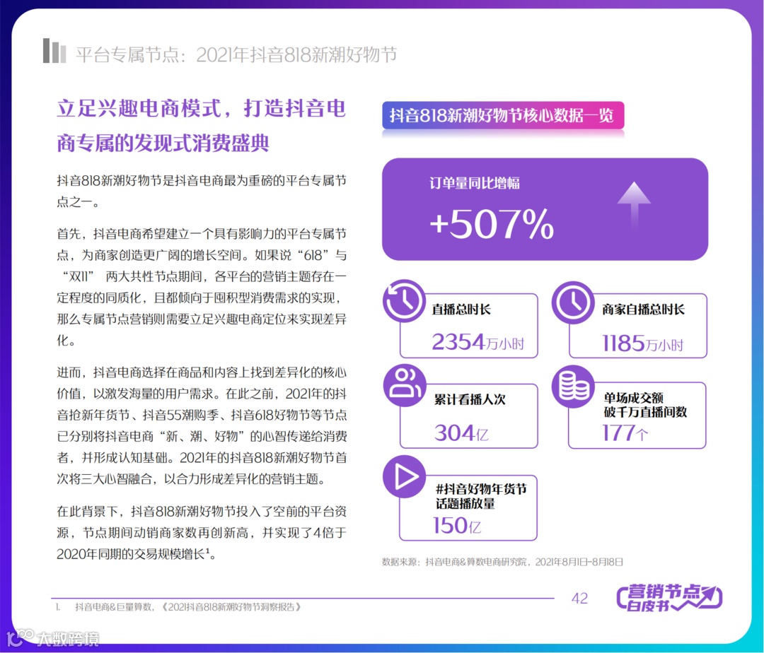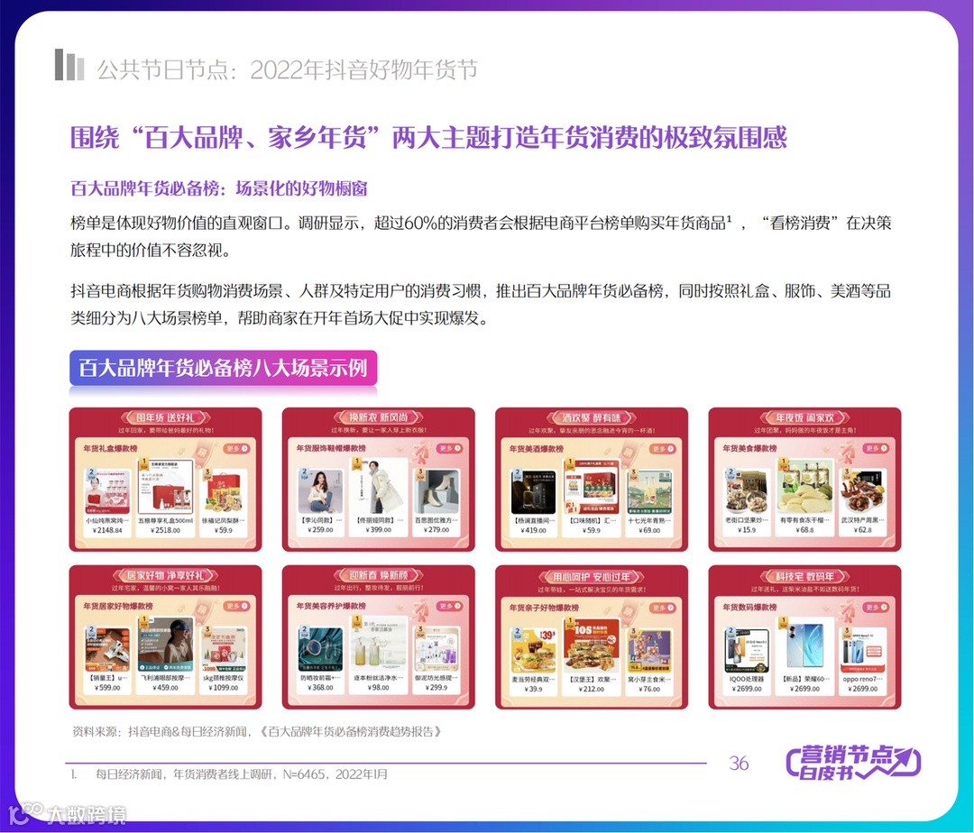 找准内容赛道、积蓄内容资源、建立全域内容阵地,这三重方法论一定程度上为品牌指明了方向。结合《2022 抖音电商节点营销白皮书》来看,如 618、双 11 这样的行业共性节点、如春节、国庆这样的公共节日节点以及如抖音 818 新潮好物节这样的平台专属节点,都将成为品牌探寻增长突破口的时机。平台专属节点面向品牌开放了更丰富的主题,较之另两个节点更能发挥品牌的能动性。