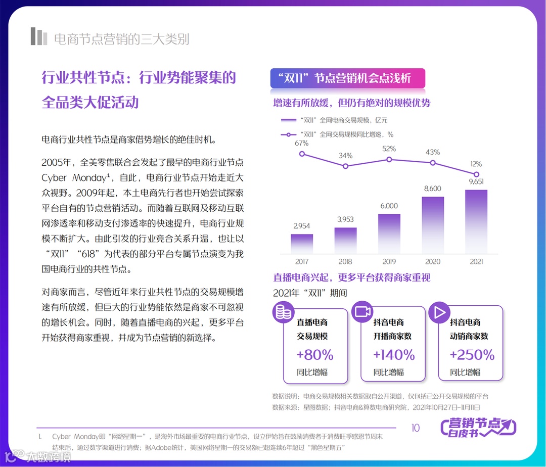 电商节点营销是由平台发起,多方深度参与的营销战役,多表现为融合多种营销手段的大规模促销活动。同时,电商节点营销以销量和客户的双重增长为核心目标。对商家而言,电商节点营销的最大吸引力来自销量增长。