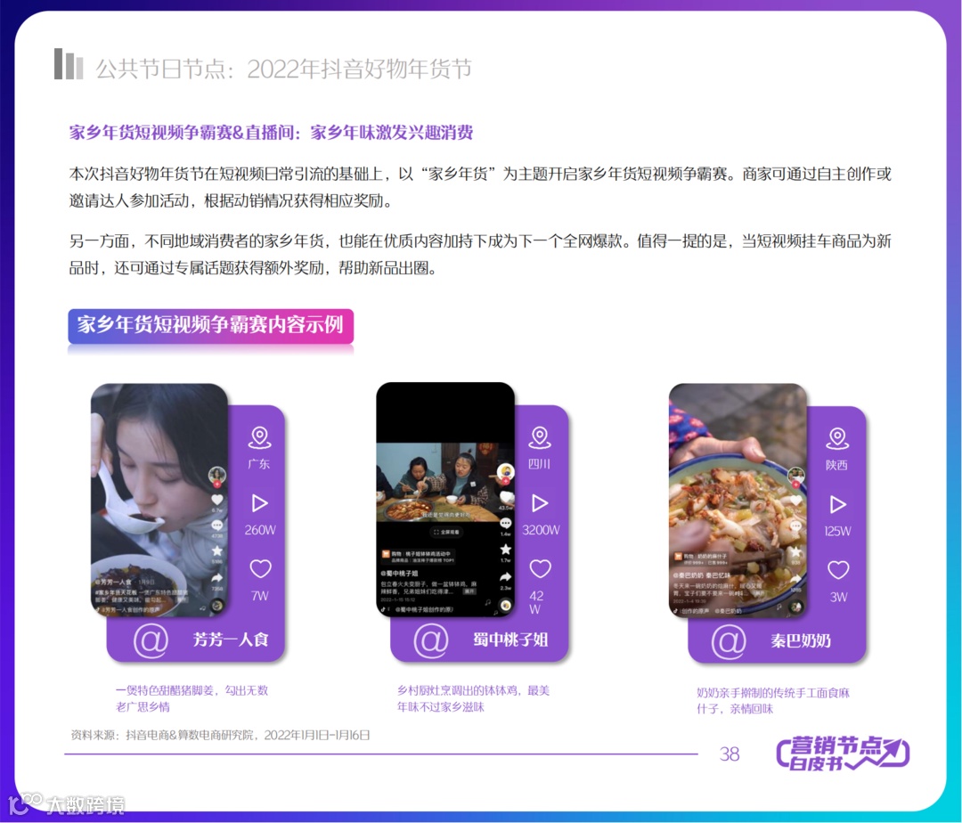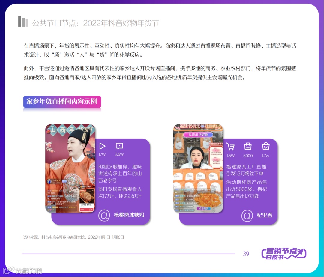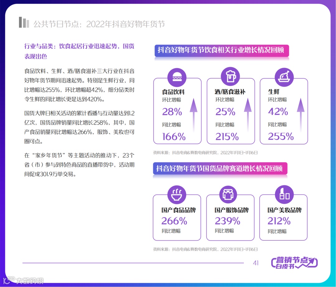 2022年抖音好物年货节是公共节日节点的典型代表,节点期间订单量同比增幅达215%。该节点从需求场景、人群流动、情感诉求三大逻辑出发定调,围绕“百大品牌、家乡年货”两大主题打造年货消费的极致氛围感,实现了饮食起居相关行业的销量爆发,食品、服饰和美妆等领域的国货品牌表现出色。