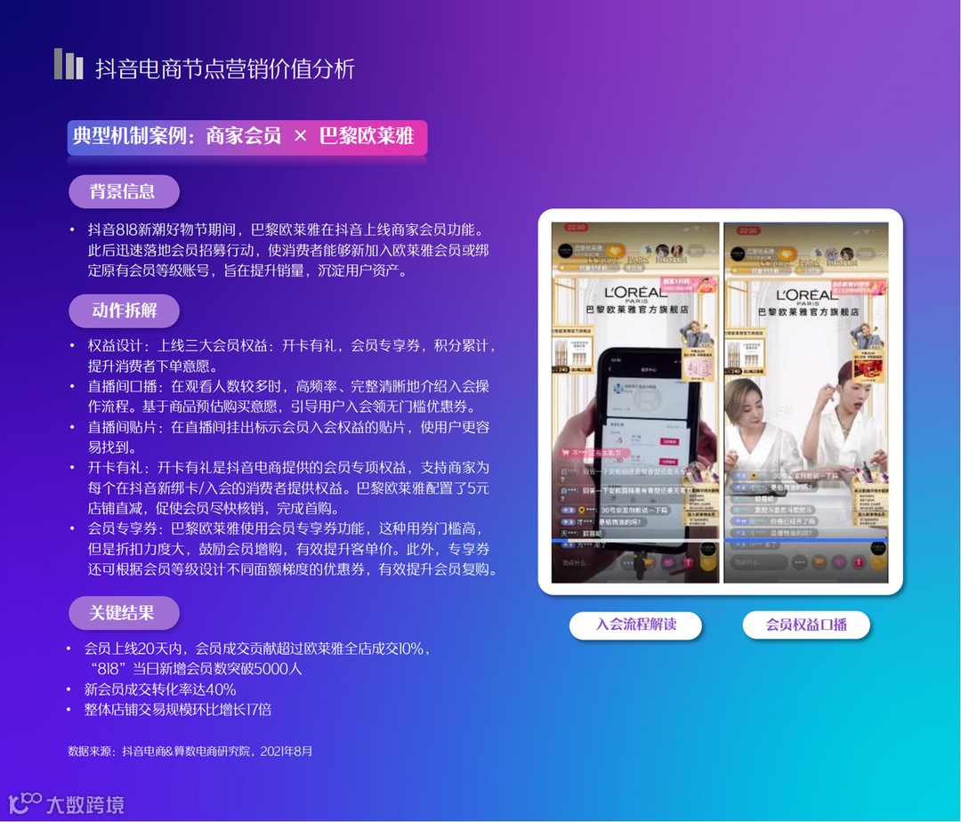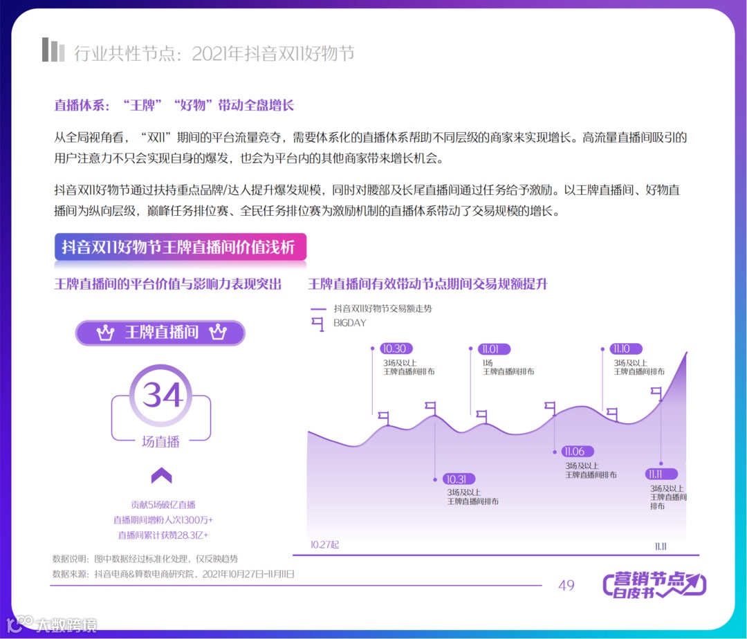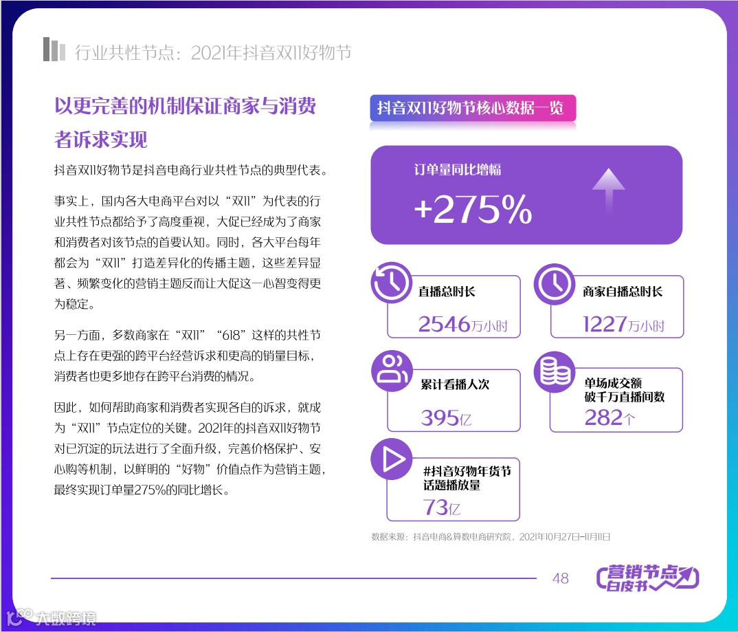 2021年2月-2022年1月,抖音电商共落地9个平台级节点营销活动,直播总时长超2亿小时,单场直播交易额破百万直播间达4.4万个。