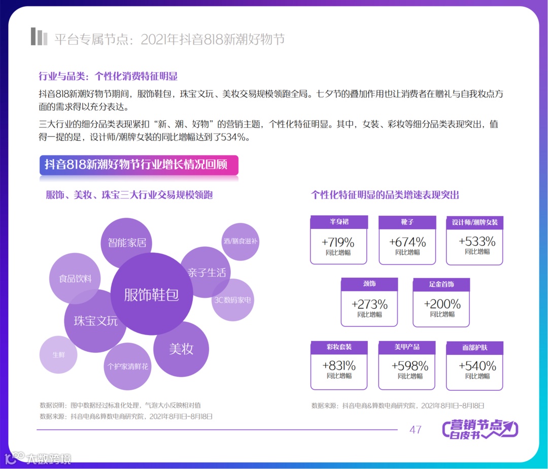 2021年抖音818新潮好物节是抖音电商的重磅平台专属节点,节点期间订单量同比增幅达507%。该节点立足兴趣电商模式,全方位构建抖音电商的“新、潮、好物”心智,并通过台网联动,打造了累计观看人数超8000万的抖音新潮好物夜晚会。从行业表现上看,个性化特征明显的品类增速表现突出。