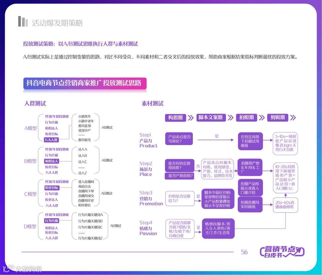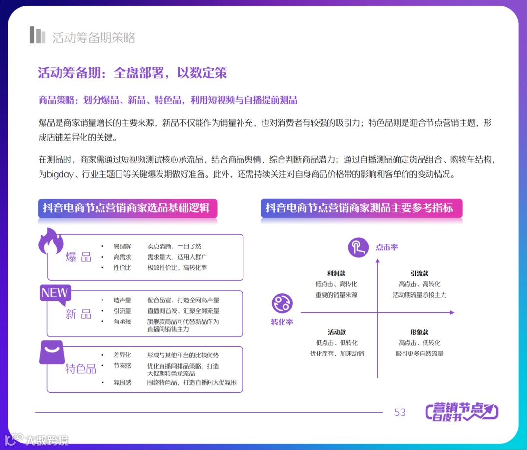在活动筹备期,商家需要全盘部署,以数定策;重点关注选品测品、预热蓄水、达人合作和投放测试。