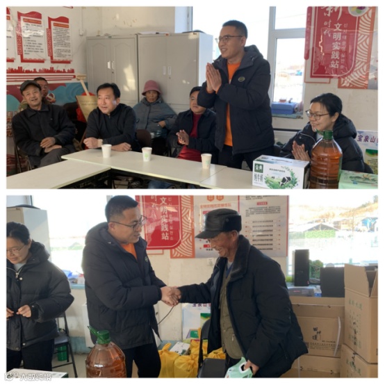 吉林省寒土地农业科技有限公司总经理王军、副总经理裴志远代表公司慰问马家岗村民,送上大米、食用油,表示企业对村民的关心与关爱。