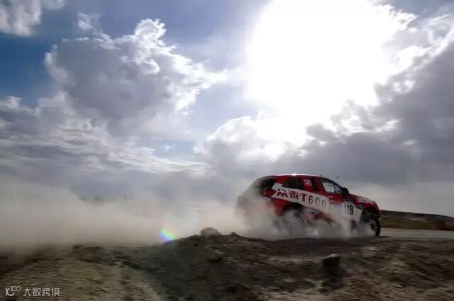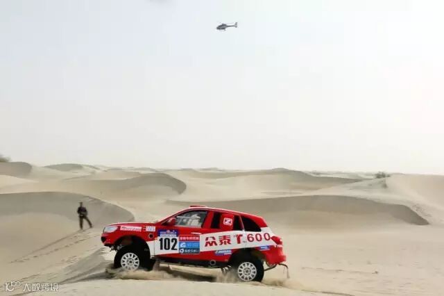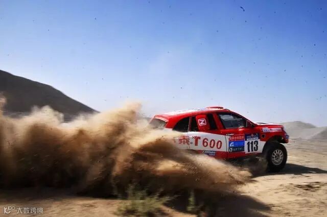 众泰车手刘彦贵、领航员沙贺驾驶众泰T600行驶在宽阔的河床赛道上。