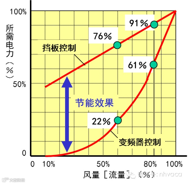 ●风机、泵等需要控制流量(风量)的场合,采用变频器控制或挡板控制,其消耗的电力和流量(风量)的关系如下图。