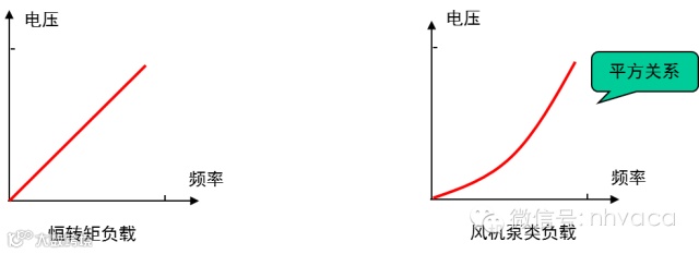 在各种风机、水泵、油泵中,随叶轮的转动,空气或液体在一定的速度范围内所产生的阻力大致与速度n的2次方成正比。随着转速的减小,转矩按转速的2次方减小。这种负载所需的功率与速度的3次方成正比。当所需风量、流量减小时,利用变频器通过调速的方式来调节风量、流量,可以大幅度地节约电能。由于高速时所需功率随转速增长过快,与速度的三次方成正比,所以通常不应使风机、泵类负载超工频运行。
