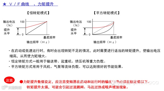 选择V/F控制的时候,根据力矩提升的设定,力矩特性不同。