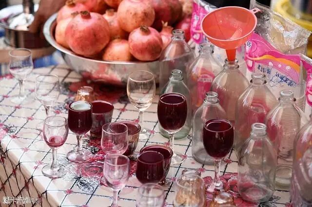 新疆的石榴汁颜色血红,我忍不住买了一杯尝尝。大概是榨汁时没有去皮的原因,口感有些涩。