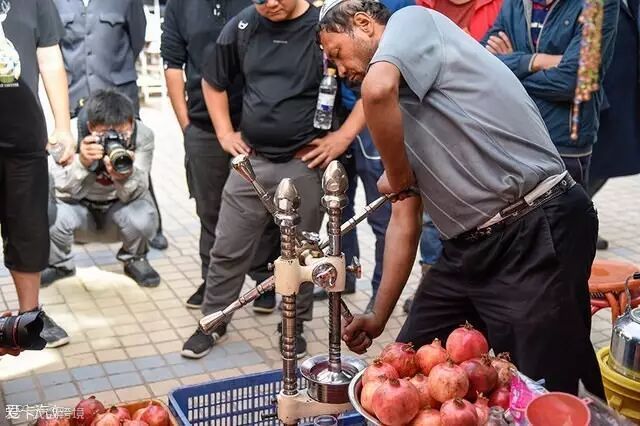 在清真寺边上,就是一条商业街。一走进去我们就被这位榨石榴汁的大叔所吸引了。