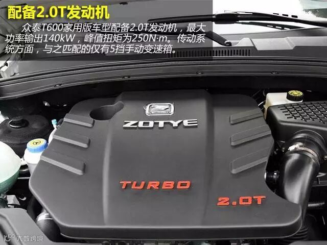 众泰T600家用版车型配备2.0T发动机,最大功率输出140kW,峰值扭矩为250N·m。传动系统方面,与之匹配的为5挡手动变速箱。