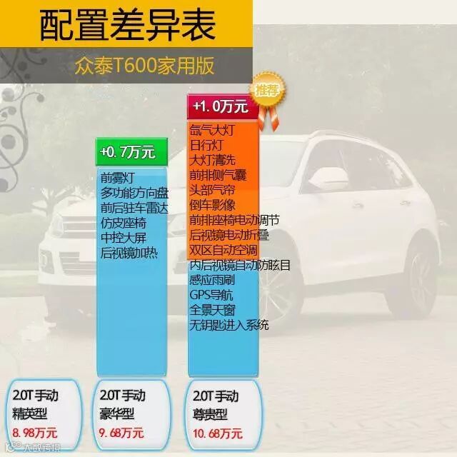 众泰T600家用版这款配备2.0T的SUV起步价仅为8.98万元,但依然配备了车身稳定系统、一键启动等配置,除此以外还有一系列选装配置。