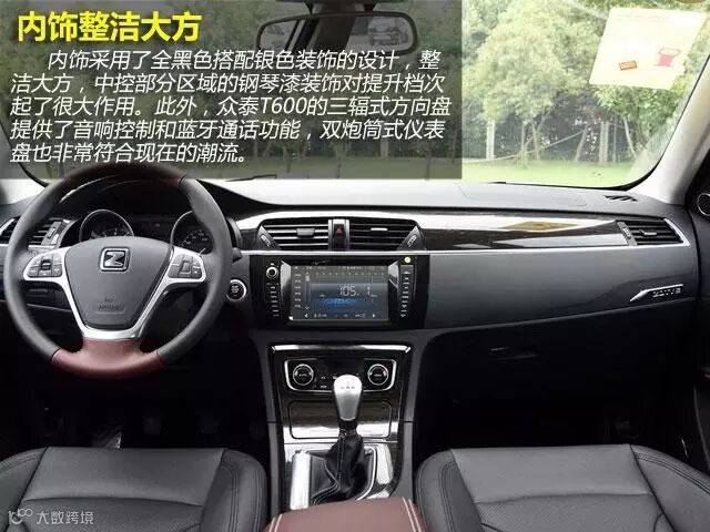 内饰采用了全黑色搭配银色装饰的设计,整洁大方,中控部分区域的钢琴漆装饰对提升档次起了很大作用。此外,众泰T600的三辐式方向盘提供了音响控制和蓝牙通话功能,双炮筒式仪表盘也非常符合现在的潮流。