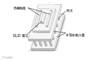 SLD 光源内部结构示意图如图所示。其由 SLD 管芯、热敏电阻、热 沉、半导体制冷器(TEC)、尾纤、外壳等部 件组成。TEC 用来控制和稳定光源的管芯温度, 热敏电阻用来敏感光源管芯温度的变化,热沉 导热系数大,用于散热。