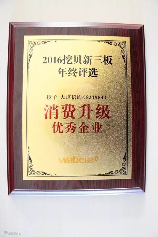 在2016年度挖贝网举办的以“开创格局 领先之道”为主题的年终评选,大道信通在评选中荣获“消费升级优秀企业”称号!