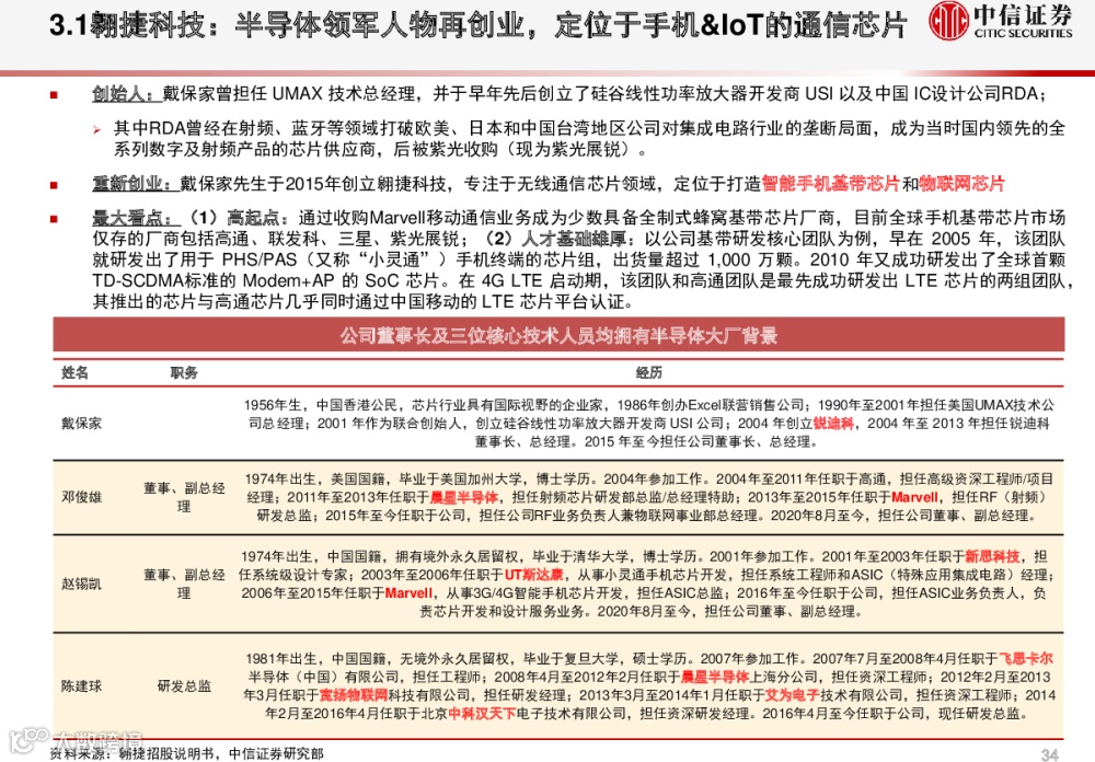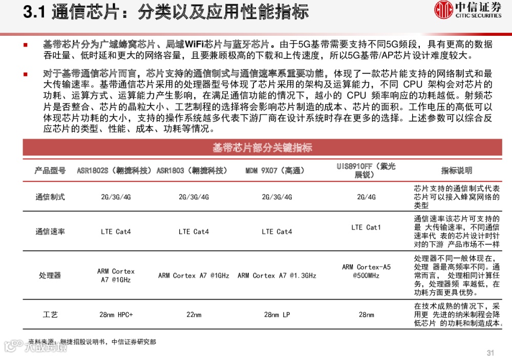 对于基带通信芯片而言,芯片支持的通信制式与通信速率系重要功能,体现了一款芯片能支持的网络制式和最 大传输速率。基带通信芯片采用的处理器型号体现了芯片采用的架构及运算能力,不同 CPU 架构会对芯片的 功耗、运算方式、运算能力产生影响,在满足通信功能的情况下,越小的 CPU 频率响应的功耗越低。射频芯 片是否整合、芯片的晶粒大小、工艺制程的选择将会影响芯片制造的成本、芯片的面积。工作电压的高低可以 体现芯片功耗的大小,支持的操作系统越多代表下游厂商在设计系统时存在更多的选择。上述参数可以综合反 应芯片的类型、性能、成本、功耗等情况。
