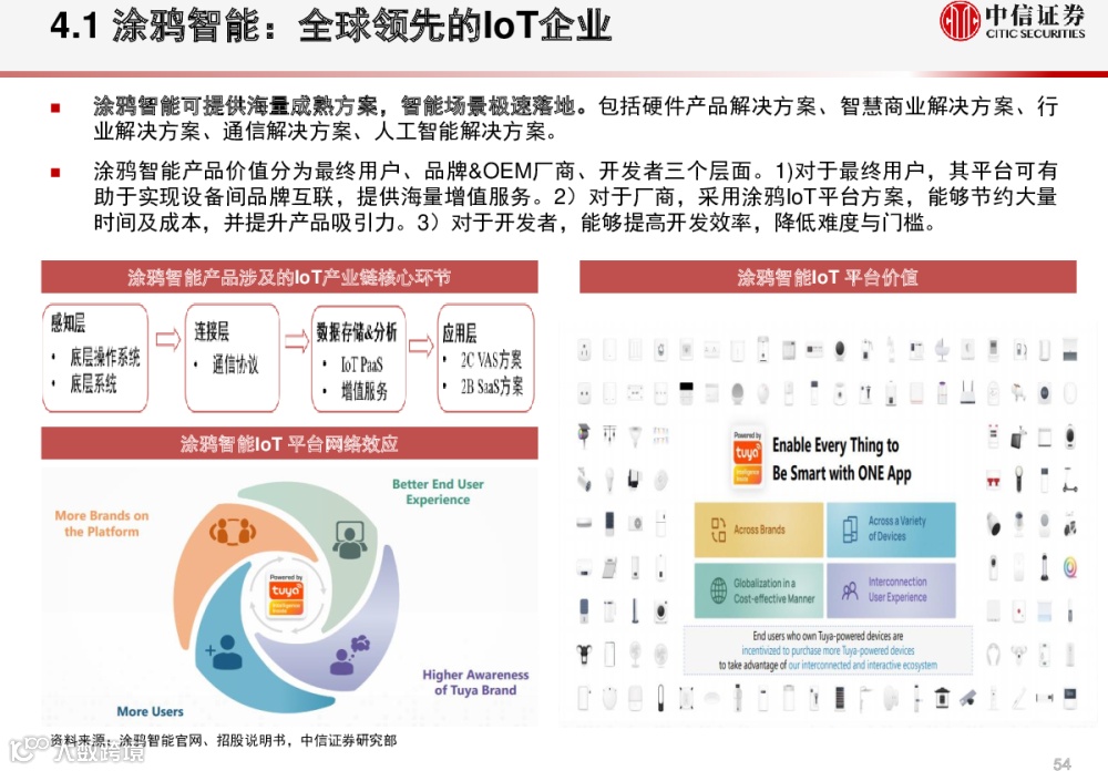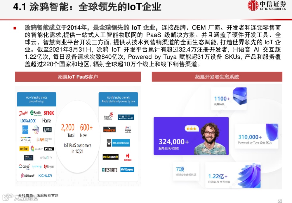 涂鸦智能成立于2014年,是全球领先的 IoT 企业,连接品牌、OEM 厂商、开发者和连锁零售商 的智能化需求,提供一站式人工智能物联网的 PaaS 级解决方案。并且涵盖了硬件开发工具、全 球云、智慧商业平台开发三方面, 提供从技术到营销渠道的全面生态赋能, 打造世界领先的 IoT 企 业。截至2021年3月31日, 涂鸦 IoT 开发平台累计有超过32.4万注册开发者, 日语音 AI 交互超 1.22亿次, 每日设备请求次数840亿次, Powered by Tuya 赋能超31万设备 SKUs, 产品和服务覆 盖超过220个国家和地区, 辐射全球超10万个线上和线下销售渠道。