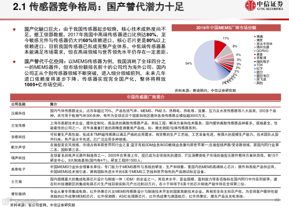 国产替代千亿空间:以MEMS传感器为例,我国消耗了全球四分之 一的MEMS器件,但市场份额排名前十的公司均为海外公司。国内 公司正从个别传感器领域不断突破,进入细分领域前列,未来几年进口依赖度将逐步下降。传感器实现完全国产化,整体将释放 1000+亿市场空间。