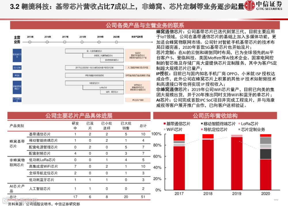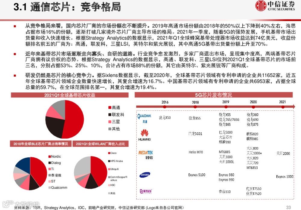 通信芯片主要指基带芯片,作为蜂窝移动通信模组的核心组成部分,是用来编码即将发射的基带信号,或对接收到的基 带信号进行解码的集成电路。基带芯片可以实现对传输信号的调制、编译与加密,是一种用于无线电传输、数据收发及 完成通信终端信息处理功能的数字芯片。