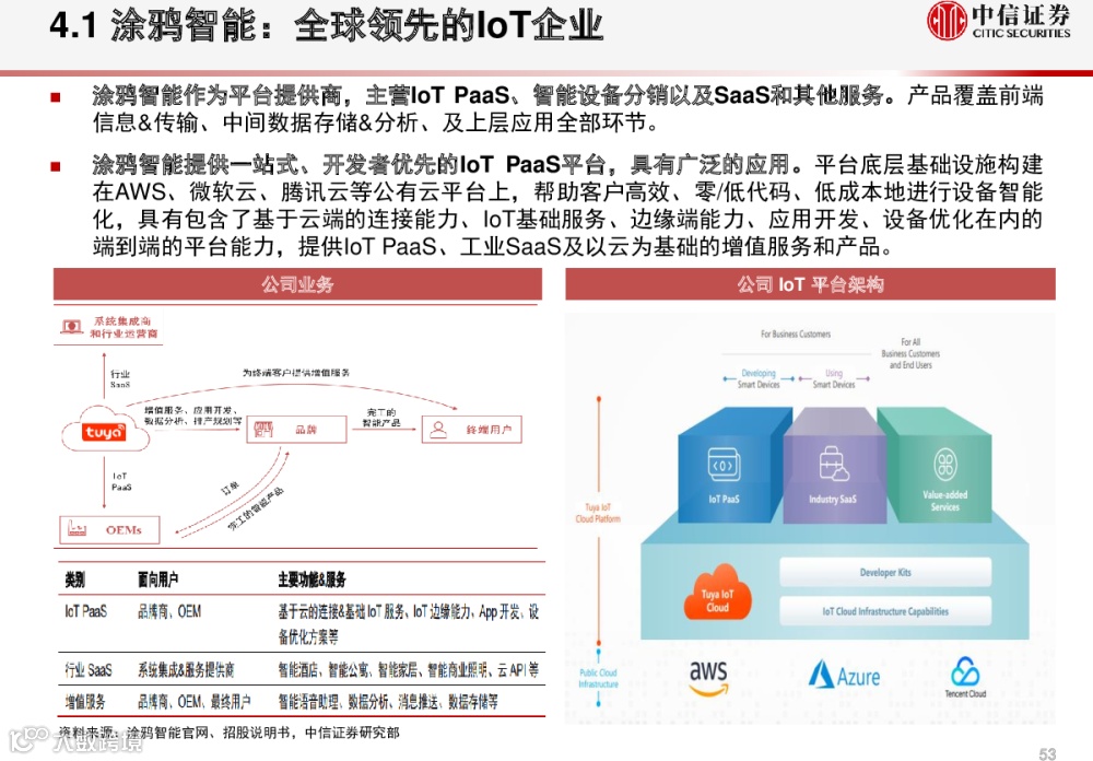 涂鸦智能提供一站式、开发者优先的IoT PaaS平台,具有广泛的应用。平台底层基础设施构建 在AWS、微软云、腾讯云等公有云平台上,帮助客户高效、零/低代码、低成本地进行设备智能 化,具有包含了基于云端的连接能力、IoT基础服务、边缘端能力、应用开发、设备优化在内的 端到端的平台能力,提供IoT PaaS、工业SaaS及以云为基础的增值服务和产品。
