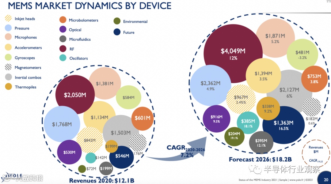 在经历了疲软的2019和2020年后,Yole的分析师预测,该市场将在2021年增长11%,达到134亿美元。之后以高个位数增长,2026年将增加到开头说的市值。