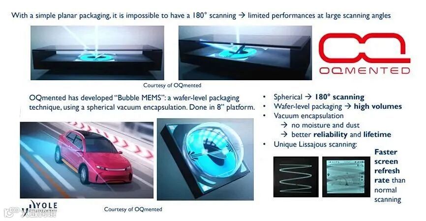 光学MEMS独立反射镜是用于激光雷达和AR/VR应用的Bubble MEMS,可能是下一代用于独立反射镜的封装。2021年3月,ST和OQmented联合研制出先进的MEMS微镜激光束,在此基础上OQmented将开始进一步转化和量产其Bubble MEMS 3D玻璃MEMS微镜真空密封专利技术。使用这些独特的气泡状玻璃密封反射镜的方法可以消除环境中的致污物,实现更清晰的成像。