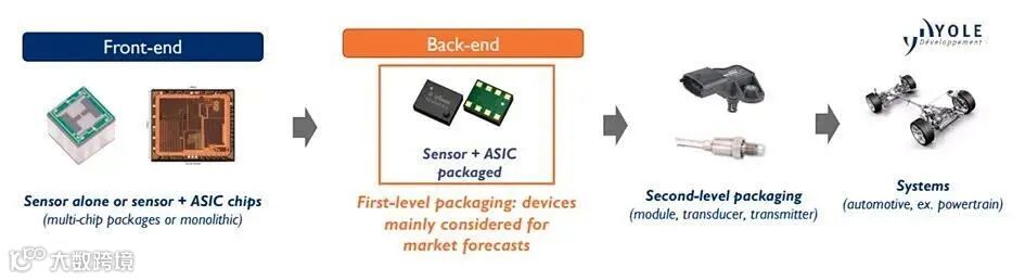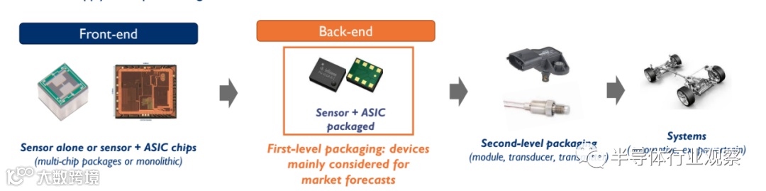 MEMS传感器的供应链定位包括前端制造、后端制造、二级封装和系统。MEMS传感器芯片由硅制成(前端制造),通常与ASIC芯片组装,并封装在一级封装中(后端制造)。二级封装增加了更多的电子元件、坚固的外壳和连接器。通常市场统计只考虑一级封装的价值。