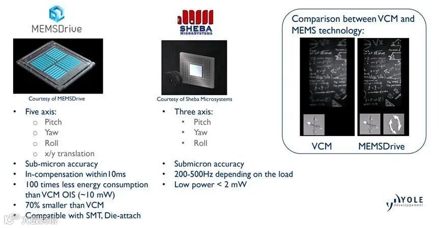 用于OIS(光学稳像)的MEMS技术比VCM(音圈马达)OIS技术耗电更少,成像更精确。MEMS技术已成为光学图像稳定的新选择,一个主要玩家是美国的MEMS Drive,它是一家创新型无晶圆厂半导体公司,主要致力于研发,制造和营销以微机电技术为基础的驱动马达,目前产品主要应用在便携式电子移动设备摄像头。2018年,全球唯一芯片级光学防抖技术MEMS OIS首次在媲美专业单反的手机上实现五轴光学防抖技术,移动拍照媲美专业级单反相机的时代真正来临。